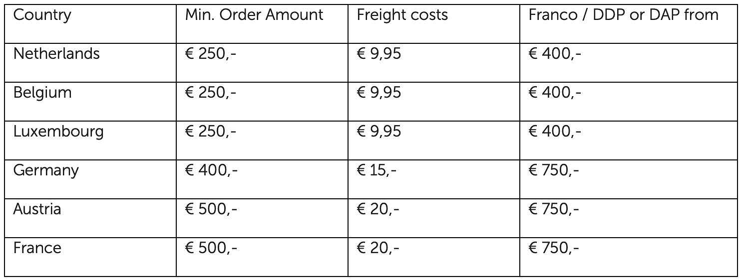 Autres pays : La valeur minimale de commande pour les autres pays est de 750 €. Pour les frais de transport et plus d’informations, veuillez envoyer un e-mail à salessupport@vadobag.nl. ATTENTION ! Les frais de transport peuvent varier en fonction du volume des produits.