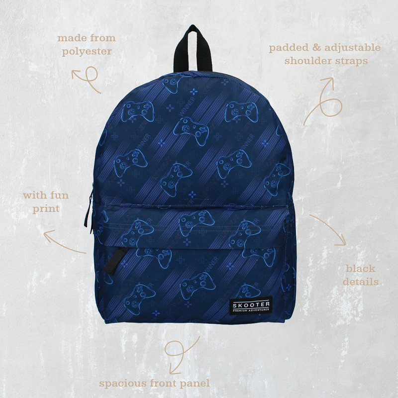 Ce sac à dos Skooter de la collection « Gamers Unite » est un véritable must-have pour les jeunes fans de jeux. Le sac à dos est de couleur bleue et est imprimé d'un motif unique de contrôleurs de jeux. Le sac à dos idéal pour l'école ou le sport ! Le compartiment principal spacieux offre beaucoup d'espace pour les livres scolaires, la boîte à lunch ou les accessoires de jeu et se ferme solidement grâce à une double fermeture à glissière noire. Il y a également une poche zippée supplémentaire sur le devant, idéale pour les petits objets. Les bretelles rembourrées et réglables assurent un confort de transport optimal et sont faciles à ajuster à la longueur souhaitée. Grâce à la boucle renforcée située sur le dessus, le sac peut également être facilement accroché à un portemanteau ou à un crochet. Que vous alliez à l'école ou que vous partiez à l'aventure, ce sac à dos montrera que vous faites partie de l'équipe des joueurs !