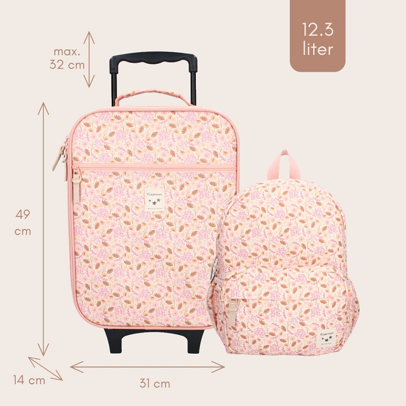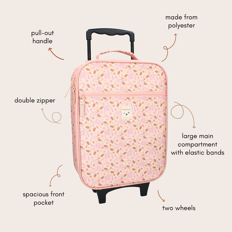 Op reis gaan wordt een nog groter feestje met deze trolley van Kidzroom uit de ‘Enchanted Memories’ collectie. Vanaf nu kan jouw kind zijn of haar vakantie spullen zelf meenemen en kun je de koffer eenvoudig herkennen door de gave print. Het grote hoofdvak biedt voldoende ruimte voor zwemkleding, speelgoed en zonnebrand. Maar daarnaast passen ook de nodige normale kledingsetjes en schoenen erin. De trolley koffer is licht roze van kleur en voorzien van een all-over print met bloemen. Door middel van de dubbele ritssluiting kun je eenvoudig bij de nodige spullen. Het handvat is uittrekbaar en de twee wieltjes zorgen ervoor dat de trolley makkelijk voort te trekken is. De koffer beschikt verder over een voorvak met ritssluiting voor kleinere items zoals ondergoed en verzorgingsproducten.