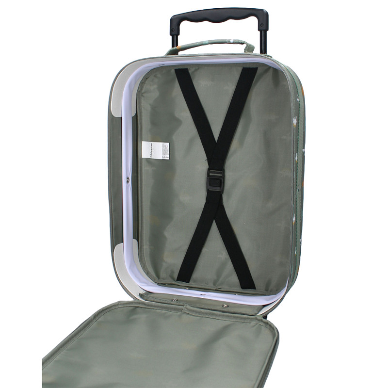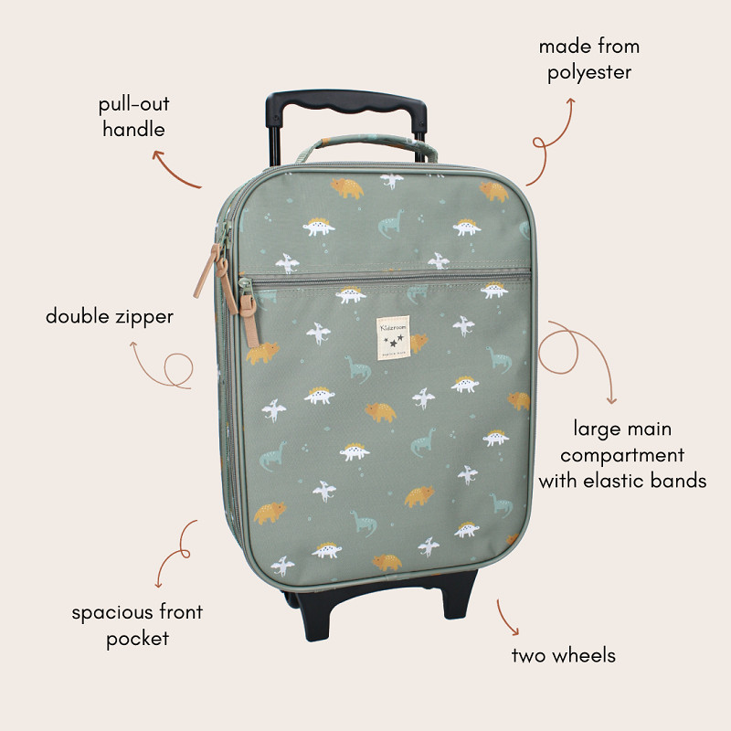 Op reis gaan wordt een nog groter feestje met deze trolley van Kidzroom uit de ‘Small Talk’ collectie. Vanaf nu kan jouw kind zijn of haar vakantie spullen zelf meenemen en kun je de koffer eenvoudig herkennen door de gave print. Het grote hoofdvak biedt voldoende ruimte voor zwemkleding, speelgoed en zonnebrand. Maar daarnaast passen ook de nodige normale kledingsetjes en schoenen erin. De trolley koffer is groen van kleur en voorzien van een all-over print met dino’s. Door middel van de dubbele ritssluiting kun je eenvoudig bij de nodige spullen. Het handvat is uittrekbaar en de twee wieltjes zorgen ervoor dat de trolley makkelijk voort te trekken is. De koffer beschikt verder over een voorvak met ritssluiting voor kleinere items zoals ondergoed en verzorgingsproducten.