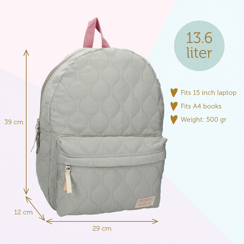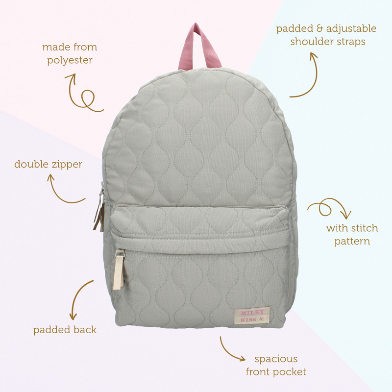Ontdek de magie van deze rugzak van Milky Kiss uit de Sweet Bliss collectie. De tas heeft een zachte groene kleur met fijne roze details. Hij heeft doorgestikt patroon wat zorgt voor een speels effect. Het hoofdvak van de rugzak is ruim en perfect voor het opbergen van alle benodigdheden, terwijl het voorvak extra gemak biedt voor kleinere items. De hoogwaardige ritssluitingen zorgen voor veilige opslag, terwijl de gewatteerde en verstelbare schouderbanden zorgen voor ultiem draagcomfort, zelfs tijdens lange dagen onderweg. Of het nu gaat om een dagje op school of een uitje met vrienden, de Rugzak Milky Kiss Sweet Bliss is de perfecte keuze voor jonge trendsetters die op zoek zijn naar stijl en functionaliteit in één.