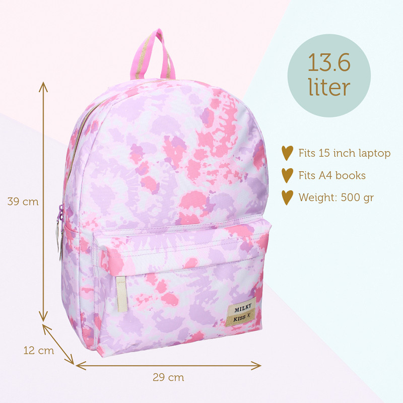 Ga trendy op pad met deze Milky Kiss rugzak uit de "Love and Laughter" collectie! Deze tas is perfect voor wie durft op te vallen. Met een prachtige mix van roze en paarse kleur en print, is deze rugzak een echt fashion statement. Het heeft één ruim hoofdvak en een handig voorvak om alle spullen georganiseerd te houden. De verstelbare schouderbanden zorgen voor optimaal draagcomfort, terwijl het hengsel aan de bovenkant het gemakkelijk maakt om de tas in je hand te dragen. Met het logo van Milky Kiss rechtsonder op het voorvak, laat je ook nog eens zien dat je oog hebt voor detail. Ga voor een trendy stijl met deze Milky Kiss rugzak uit de "Love and Laughter" collectie!
