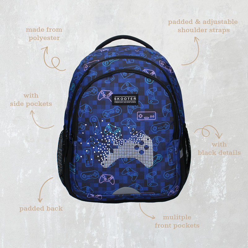 Ontdek deze rugzak van Skooter uit de Winning Streak collectie. De tas heeft een blauwe kleur met stoere gameprint. Het hoofdvak van de rugzak is ruim en perfect voor het opbergen van alle benodigdheden, terwijl de twee extra voorvakken zorgen voor gemak voor kleinere items. De hoogwaardige ritssluitingen zorgen voor veilige opslag, terwijl de gewatteerde en verstelbare schouderbanden zorgen voor ultiem draagcomfort, zelfs tijdens lange dagen onderweg. Of het nu gaat om een dagje op school of een uitje met vrienden, deze rugzak is de perfecte keuze!