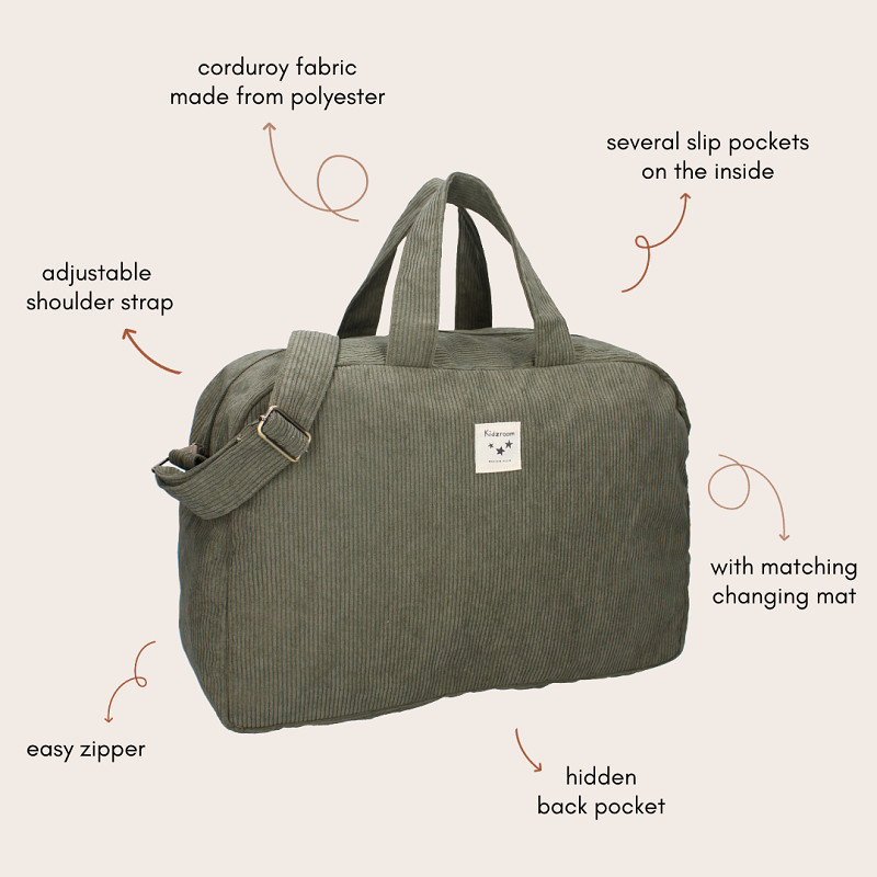 Met deze groene luiertas van Kidzroom uit de Charmful collectie is men altijd goed voorbereid op elke situatie! Gemaakt van zachte corduroy stof, straalt de tas warmte en comfort uit. De verstelbare schouderband zorgt ervoor dat de tas eenvoudig aan ieders wensen kan worden aangepast, terwijl de twee handige lussen het mogelijk maken om de tas ook in de hand te dragen. Deze praktische luiertas biedt voldoende ruimte voor alle benodigdheden en wordt geleverd met een bijpassend verschoningsmatje, zodat een kindje altijd en overal verschoond kan worden. Het biedt bovendien extra gemak en functionaliteit. Het achtervak met ritssluiting biedt extra opbergruimte voor spullen die je veilig wilt opbergen. Kortom, deze luiertas is niet alleen functioneel, maar ook heerlijk zacht en aangenaam in gebruik – ideaal voor elke ouder!