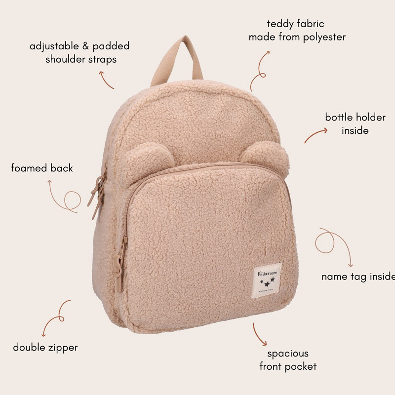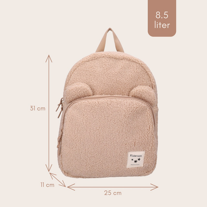 Deze beige Kidzroom rugzak uit de Beary Excited collectie is een aantrekkelijke toevoeging voor ieder B2B-assortiment in baby- en kinderaccessoires. Het zachte materiaal, het minimalistische design en de herkenbare berenoortjes zorgen voor een vriendelijke, kwalitatieve uitstraling die goed aansluit bij trends in de kindermode.