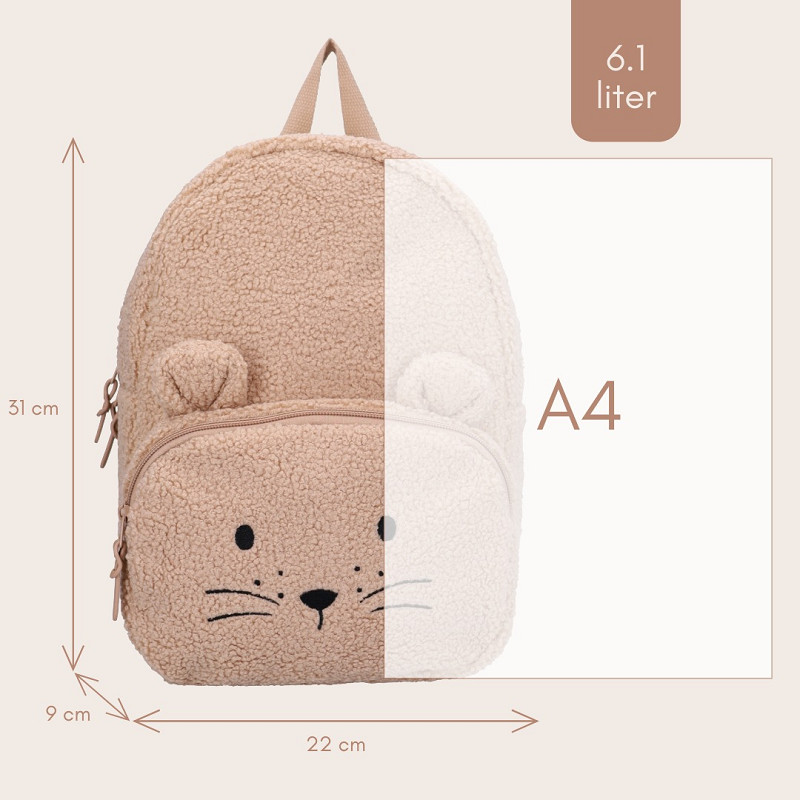 Deze rugzak uit de Kidzroom Comfort Friends collectie is een aantrekkelijke toevoeging aan iedere kindercollectie. De tas is uitgevoerd in zachte teddystof en valt extra op door de speelse berenoortjes op het voorvak, wat zorgt voor een herkenbare en kindvriendelijke uitstraling. De rugzak beschikt over een ruim hoofdvak met ritssluiting en een extra voorvak voor kleinere spullen. Dankzij de verstelbare schouderbanden en de handige draaglus aan de bovenkant biedt dit model optimaal gebruiksgemak. Met een afmeting van 27 x 19 x 8 cm en een inhoud van 4,1 liter is deze compacte rugzak ideaal voor dagelijks gebruik.