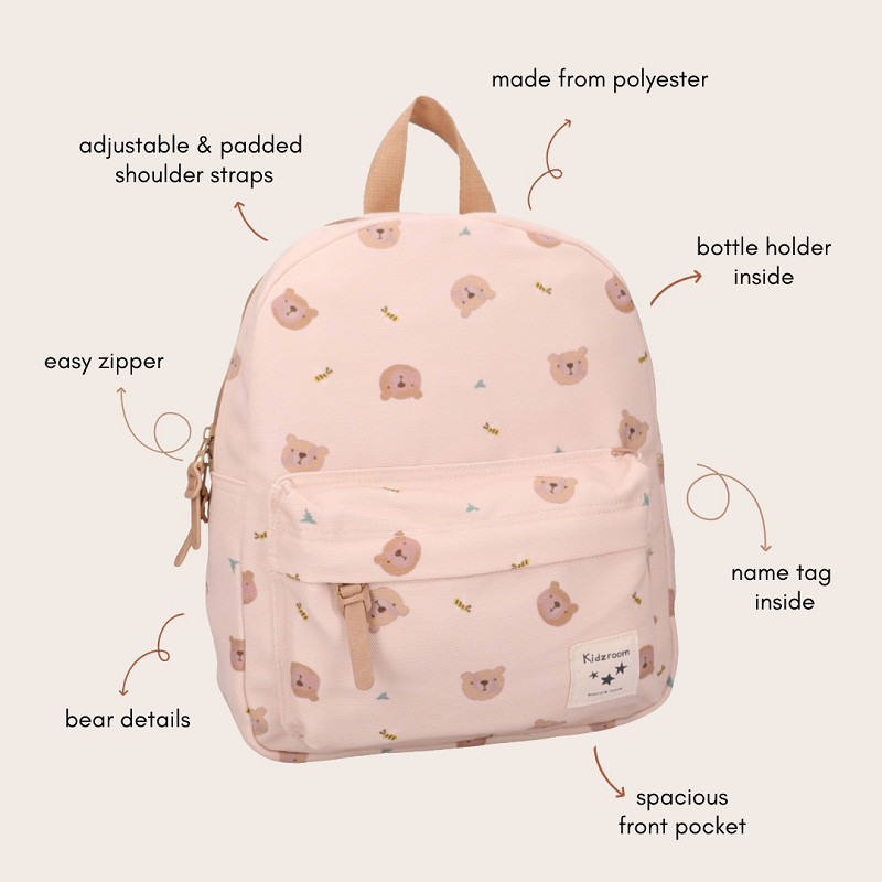 Het voorvak met rits is geschikt voor kleinere spullen. De verstelbare schouderbanden zitten comfortabel en blijven dankzij de gespen goed op hun plek. De stevige lus aan de bovenzijde maakt dragen en ophangen eenvoudig. Binnenin bevindt zich een naamlabel en een houder voor een drinkfles zodat de inhoud netjes georganiseerd blijft.