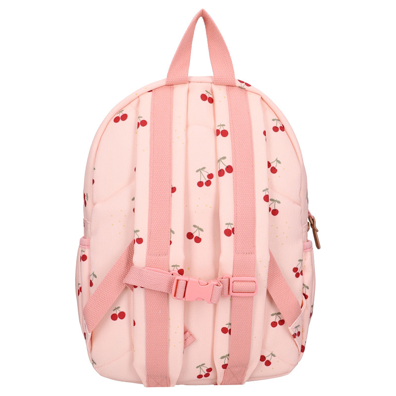 Deze tas uit de Secret Garden collectie van Kidzroom is roze van kleur en heeft een schattig ontwerp met kersjes verspreid over de tas. Het product is gemaakt van gerecycled polyester, het praktische voorvakje biedt extra opbergruimte en de handige fleshouders aan de zijkanten maken de tas ideaal voor dagelijks gebruik. Deze tas combineert stijl en functionaliteit, perfect voor jonge meisjes die van een vrolijk en speels design houden.