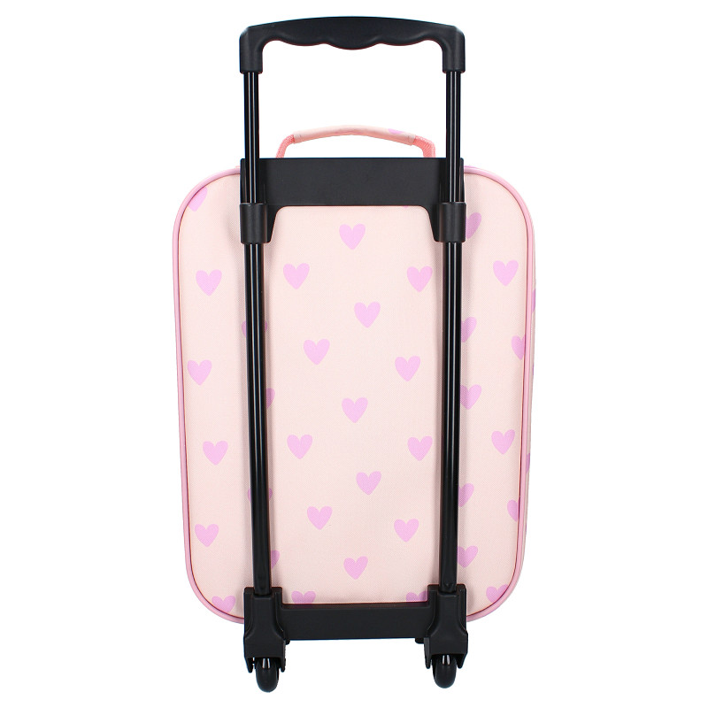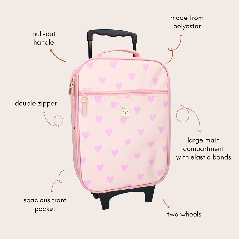 De Kidzroom Magical Meadows trolley is een aantrekkelijke kinderkoffer voor je assortiment als je op zoek bent naar een opvallend en functioneel reisartikel voor kinderen. De lichtroze trolley met all-over hartjesprint combineert een herkenbaar design met praktisch gebruiksgemak. Het ruime hoofdvak met dubbele ritssluiting biedt voldoende ruimte voor kleding, schoenen, speelgoed en toiletartikelen, terwijl het voorvak met rits ideaal is voor kleinere benodigdheden.