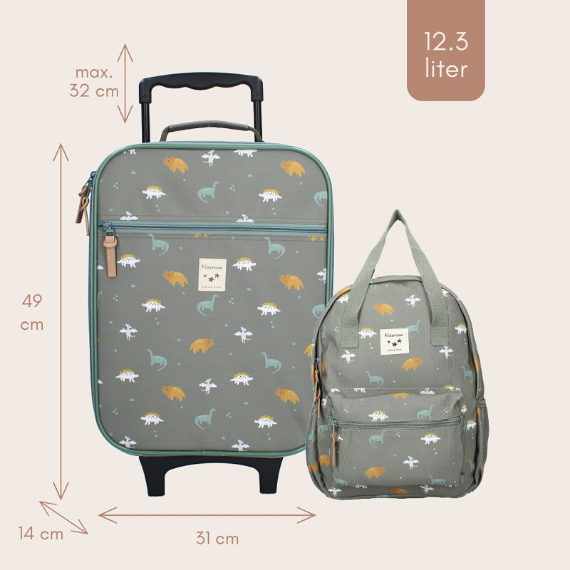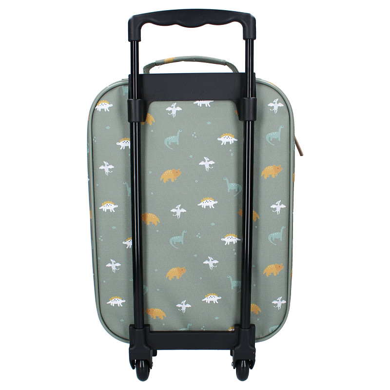 De Kidzroom Small Talk trolley is een stoere en praktische kinderkoffer voor je assortiment als je op zoek bent naar een functioneel reisartikel met een aansprekend design voor kinderen. De groene trolley met all-over dino print combineert een speelse uitstraling met gebruiksgemak en voldoende opbergruimte. Het ruime hoofdvak met dubbele ritssluiting biedt plaats aan kleding, schoenen, speelgoed en toiletartikelen, terwijl het voorvak met rits ideaal is voor kleinere benodigdheden.