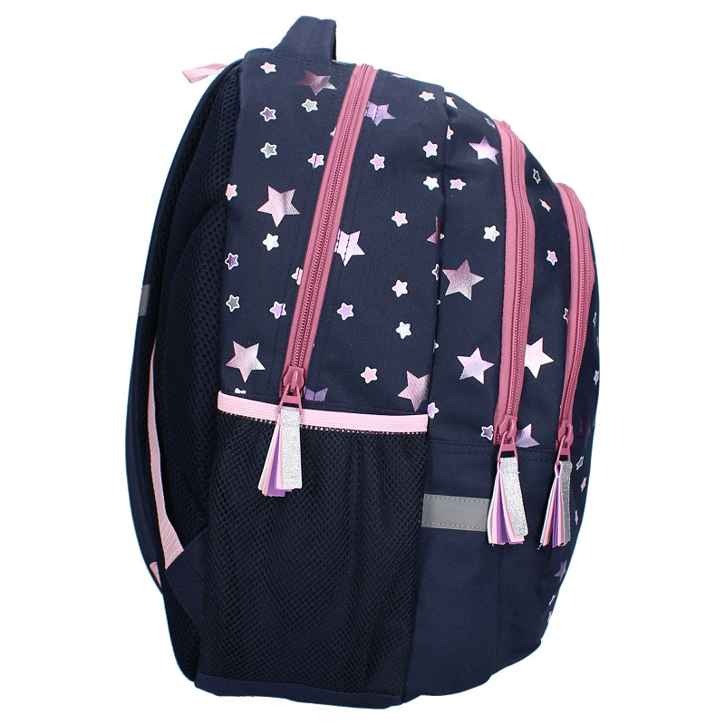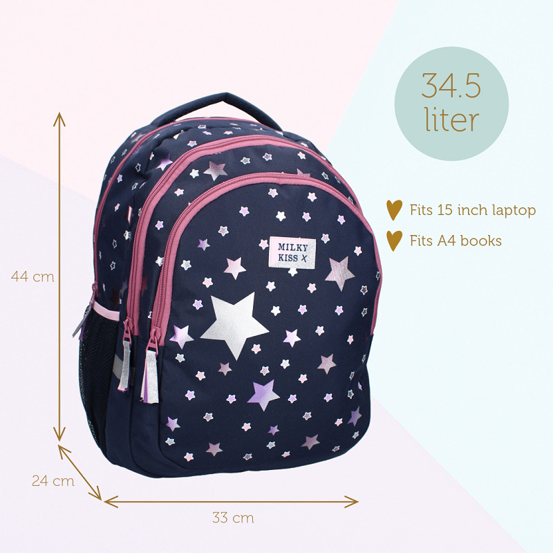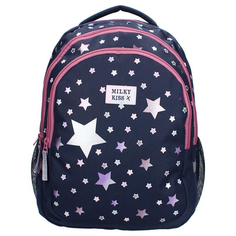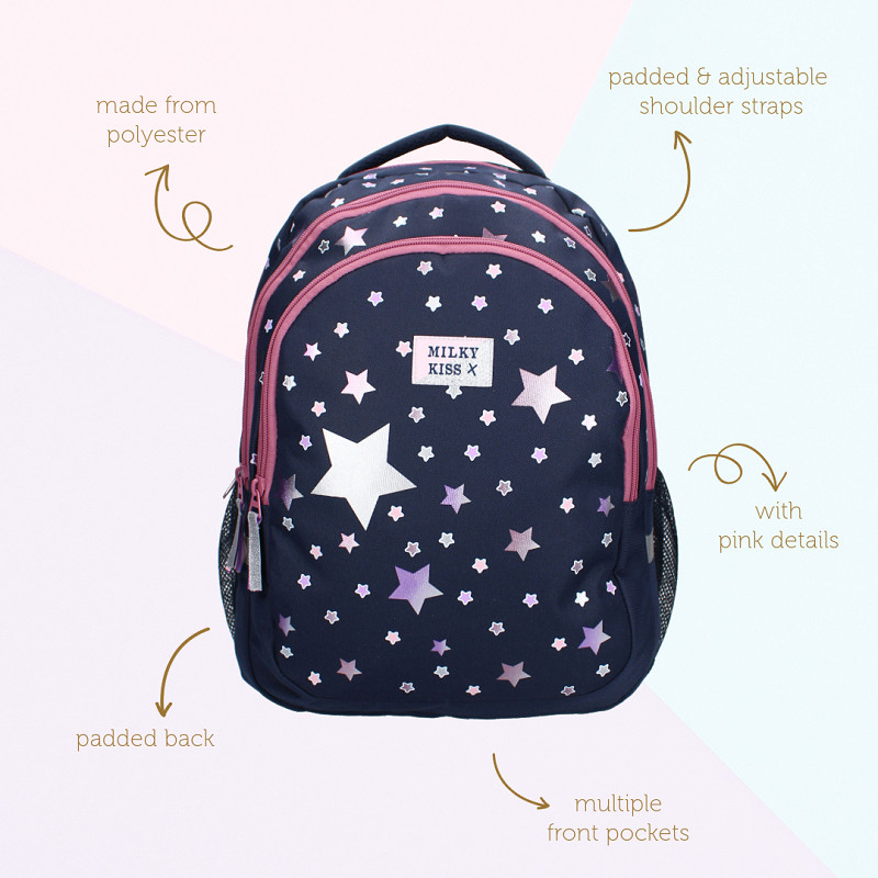 Ontdek de magie van deze rugzak van Milky Kiss uit de Fable World collectie. De tas heeft een donkerblauwe kleur met leuke paarse en roze sterren. Het hoofdvak van de rugzak is ruim en perfect voor het opbergen van alle benodigdheden, terwijl de twee extra voorvakken zorgen voor gemak voor kleinere items. De hoogwaardige ritssluitingen zorgen voor veilige opslag, terwijl de gewatteerde en verstelbare schouderbanden zorgen voor ultiem draagcomfort, zelfs tijdens lange dagen onderweg. Of het nu gaat om een dagje op school of een uitje met vrienden, deze rugzak is de perfecte keuze voor jonge trendsetters die op zoek zijn naar stijl en functionaliteit in één.