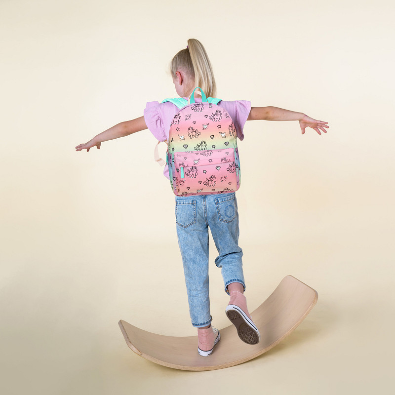 Waar worden kleine meisjes gelukkig van? Rainbows en Unicorns! De Milky Kiss Rainbows and Unicorns collectie is dan ook een prachtige must-have collectie voor kleine unicorn fans in regenboog/pastelkleuren. De rugzak heeft een ruim hoofdvak en is met rits af te sluiten, net als het kleine opbergvakje aan de voorzijde. Het rugpand is verstevigd en de schouderbanden gewatteerd en in lengte verstelbaar. De rugzak is ook te dragen aan de lus aan de bovenzijde.