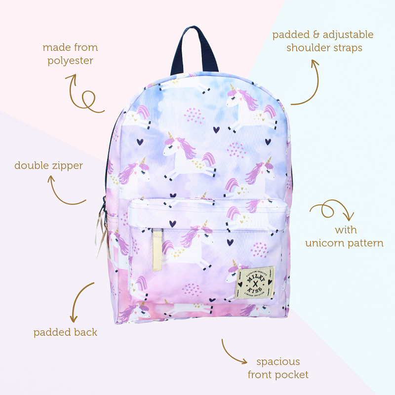 Deze magische Milky Kiss rugzak is de musthave voor iedereen die dol is op Unicorns. Deze rugtas uit de Follow the Rainbow collectie heeft een groot hoofdvak waar unicorns op afgebeeld staan. Het klein voorvakje is perfect voor kleinere spulletjes. De tas is heeft een ombré effect met lichtblauw, roze en paars. De tas is afgewerkt met (vallende) sterretjes. De glitter ritsen maken deze magische tas helemaal af! De tas heeft aan de bovenkant een lus om hem op te kunnen hangen.