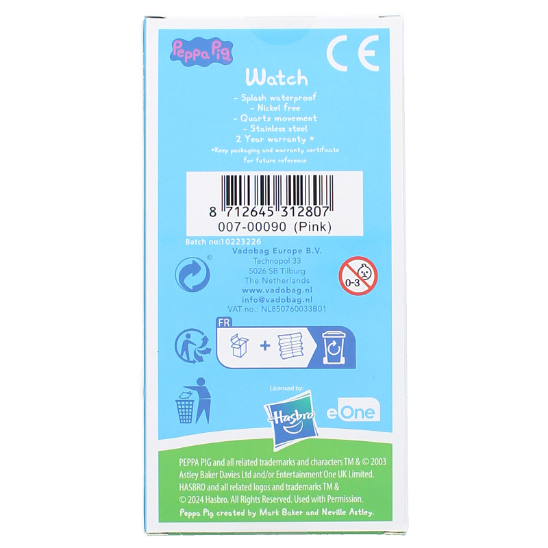 Met dit leuke Peppa Pig horloge uit de Kids Time! collectie kan ieder kind supersnel de tijd lezen en tegelijkertijd zijn of haar favoriete figuur om de pols dragen. Zo komt een kind nooit meer te laat op school of bij de sportles. Dit roze horloge is voorzien van een PVC polsband met hartjes en regenbogen. Het horloge heeft een wijzerplaat met daarop Peppa Pig, hoofdpersonage van de populaire serie, afgebeeld. De grote en kleine wijzers zijn paars van kleur. Voor elke pols is dit horloge op maat te maken, doordat de RVC gespsluiting strakker en losser te maken is. Het horloge is spatwaterdicht en heeft een garantie van 2 jaar. Het Peppa Pig horloge wordt geleverd in een mooi, op maat gemaakt doosje zodat het horloge niet beschadigd.