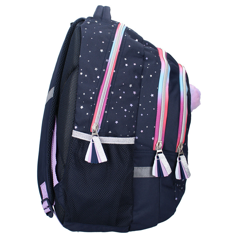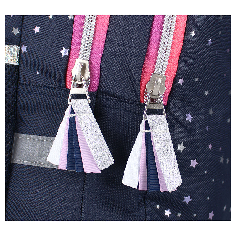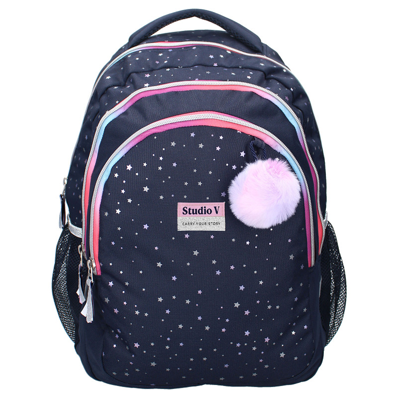 De Studio V Stargazing rugzak in blauw is een echte eyecatcher voor school én vrije tijd. De donkerblauwe basis met speelse sterrendetails en frisse kleuraccenten geeft de tas een trendy uitstraling. De fluffy pompon-hanger maakt ’m helemaal af. Praktisch is deze rugzak ook: met 3 vakken neem je schoolspullen overzichtelijk mee. Er is ruimte voor schriften, etui en een lunchbox, terwijl je kleinere items makkelijk apart houdt. Dankzij de verstelbare schouderbanden draagt de tas comfortabel, ideaal voor elke dag naar school, een uitstapje of logeerpartijtje.